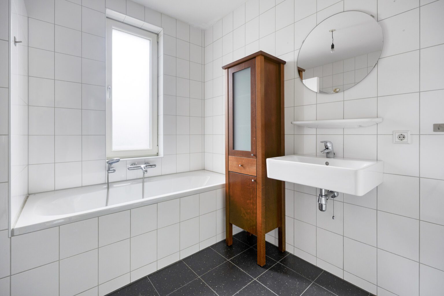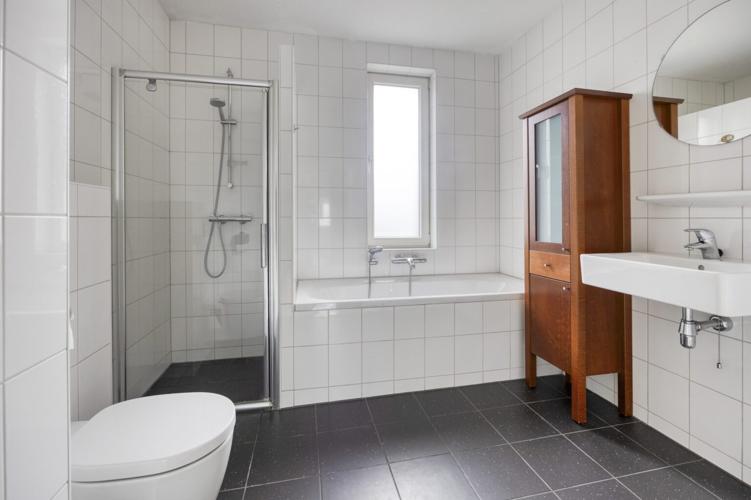 De ruime badkamer is voorzien van een wastafel met spiegel, tweede toilet, ligbad en een douchegelegenheid. Daarnaast zorgt het raam in de badkamer voor genoeg daglicht en ventilatie.