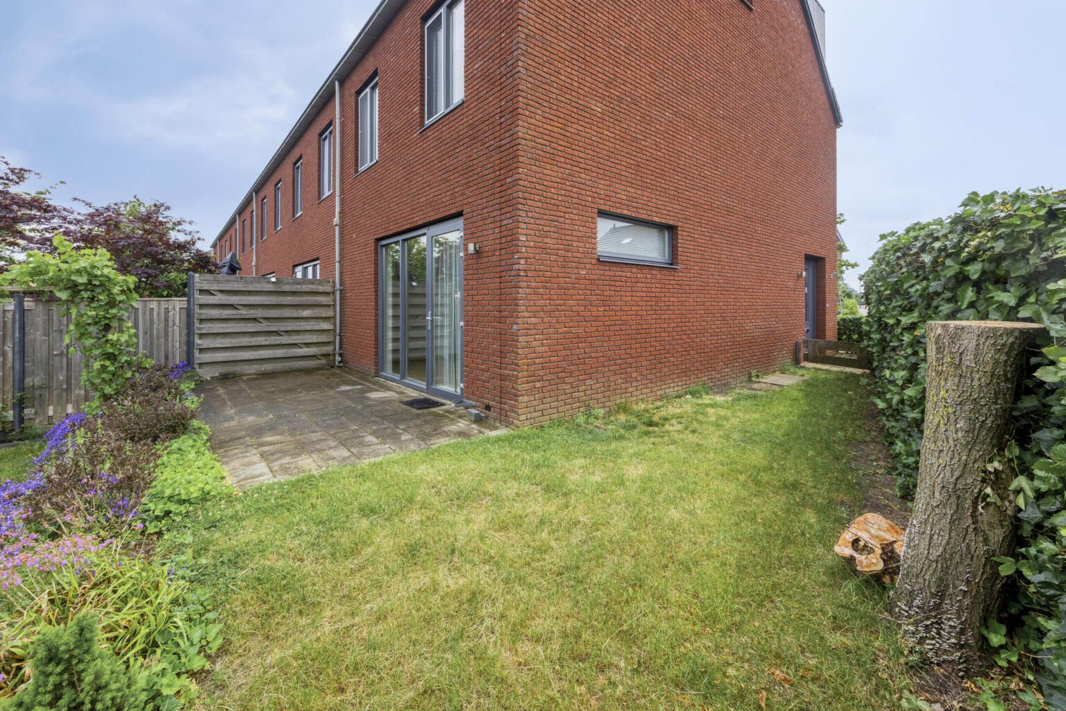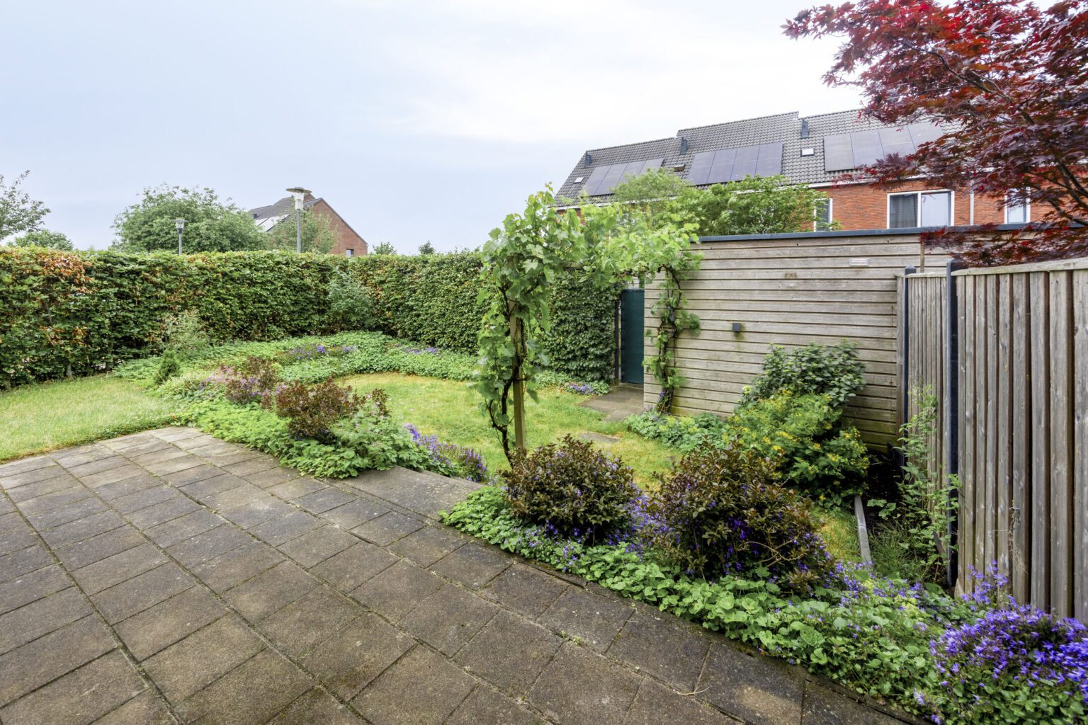 Via de deur in de woonkamer stap je de zonnige achtertuin in; een fijne plek waar je lekker comfortabel buiten kunt zitten. De tuin is grotendeels voorzien van gras en biedt volop ruimte om meerdere zitplekken te creëren. Daarnaast is er een praktische houten berging, ideaal voor het opbergen van fietsen, gereedschap en tuinspullen. Dankzij de achterom is deze eenvoudig bereikbaar.