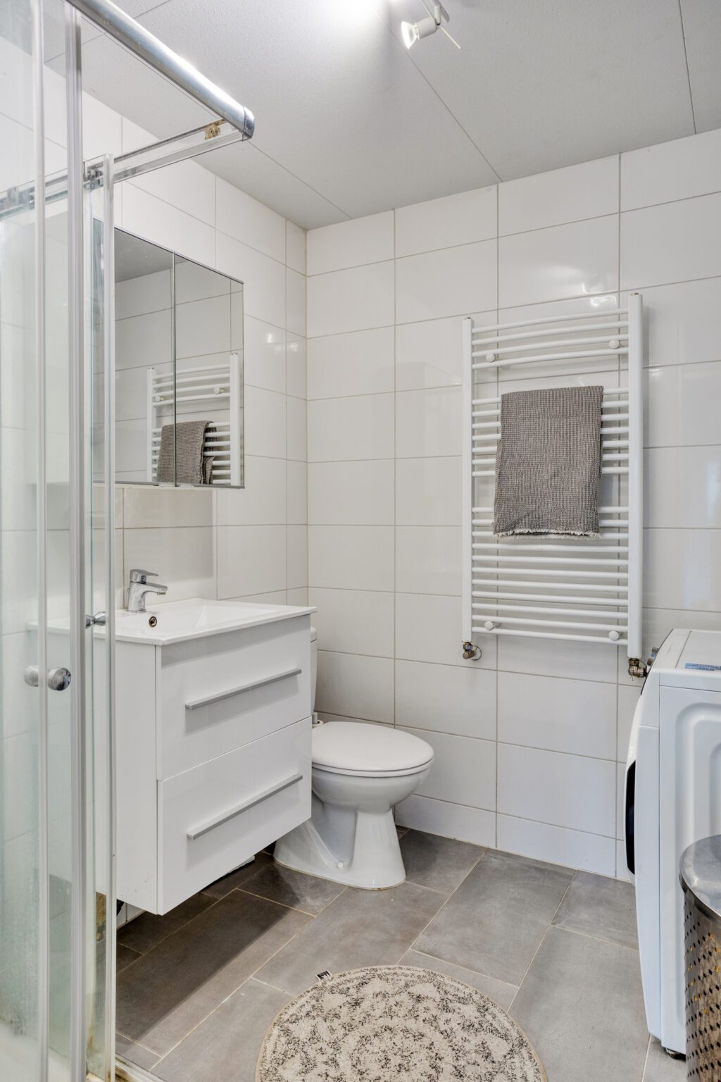 De badkamer is van alle gemakken voorzien: een tweede toilet, een wastafelmeubel en een ruime douche. Er is voldoende plek om je comfortabel af te drogen en je spullen netjes op te bergen. Daarnaast vind je hier de aansluiting voor de wasmachine.