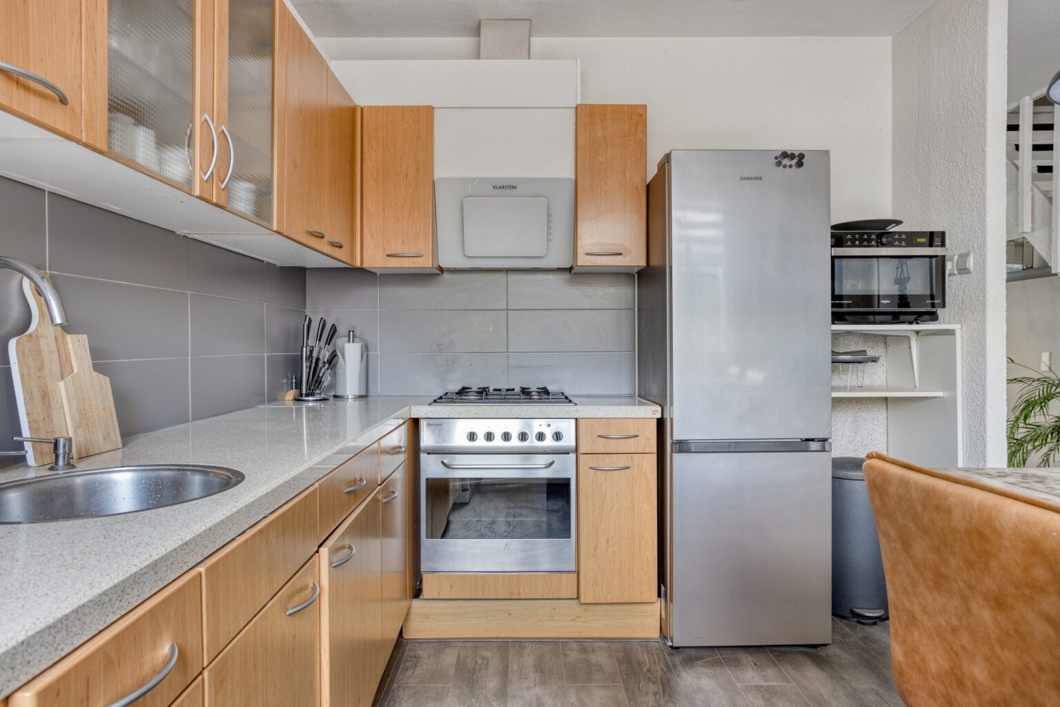De keuken is slim geplaatst: deels afgescheiden voor rust tijdens het koken, maar toch open genoeg om contact te houden met de woonkamer. Het ruime aanrechtblad biedt voldoende werkruimte, en met de grote oven, gaskookplaat en vaatwasser (2024) wordt koken en opruimen een fluitje van een cent. Bovendien is er ruimte voor een kleine eettafel om gezellig te dineren.
